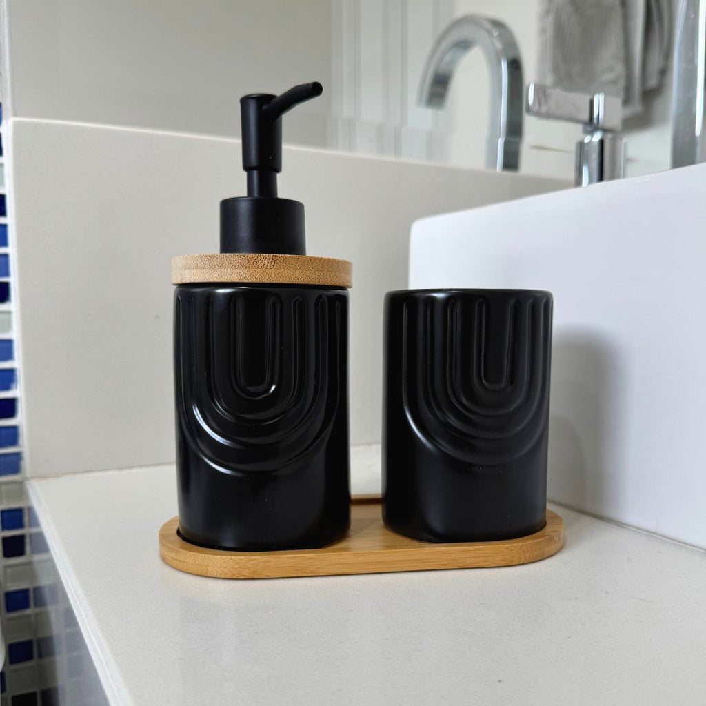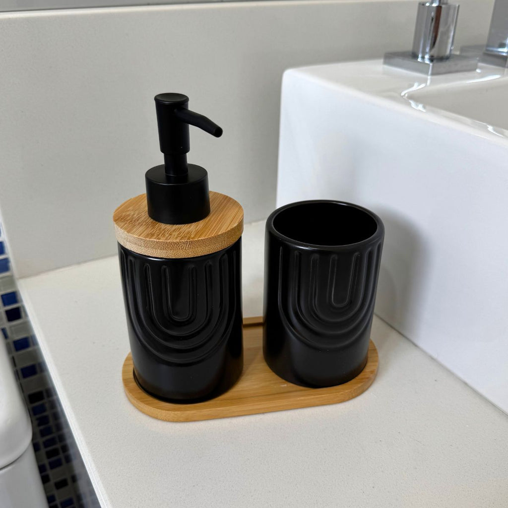 - Dispenser para sabonete líquido: Feito em porcelana premium com tampa em bambu, ideal para sabonetes ou loções.