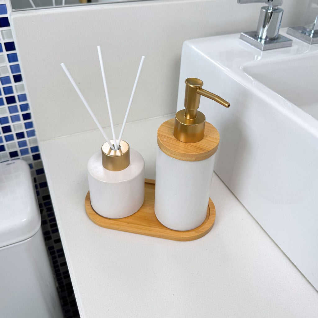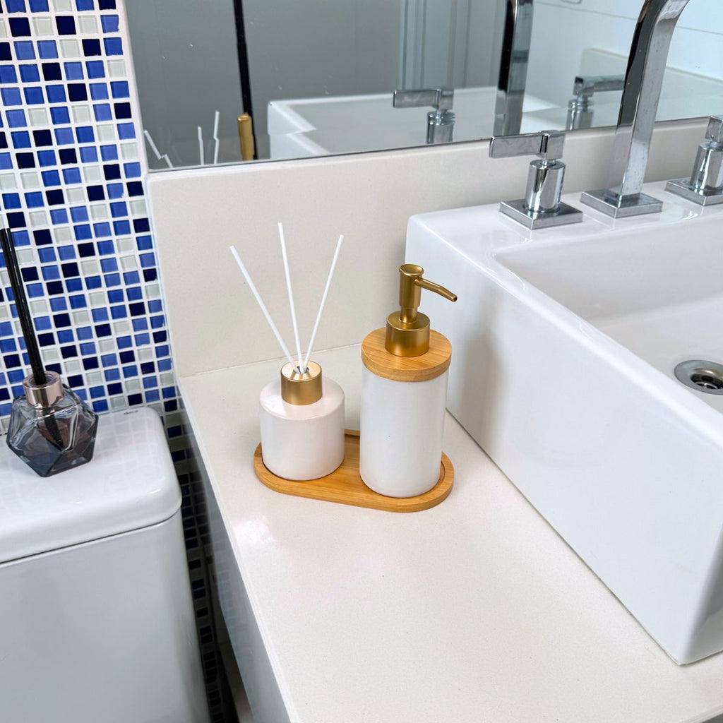 Kit Banheiro Aromas Liso 3 Peças - Conjunto Dispenser e Aromatizador em Porcelana com Bandeja em Bambu