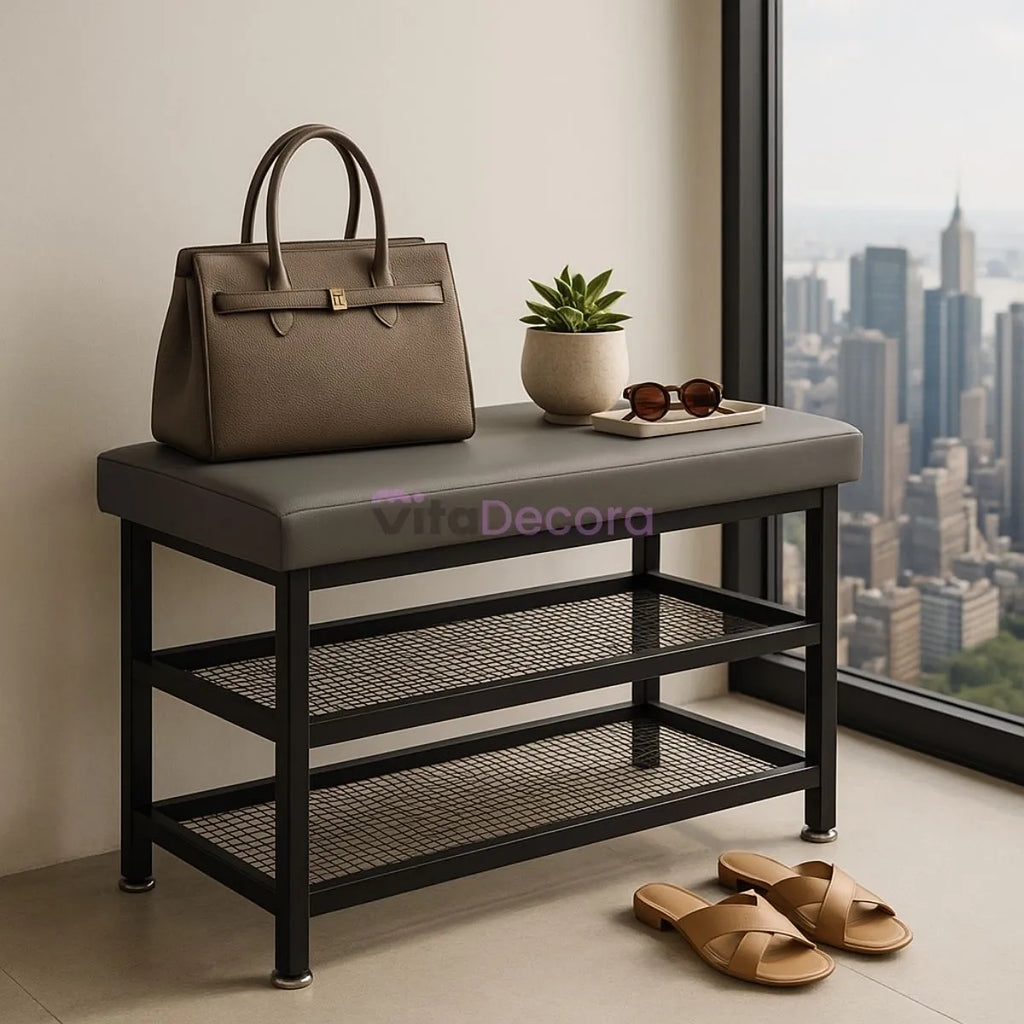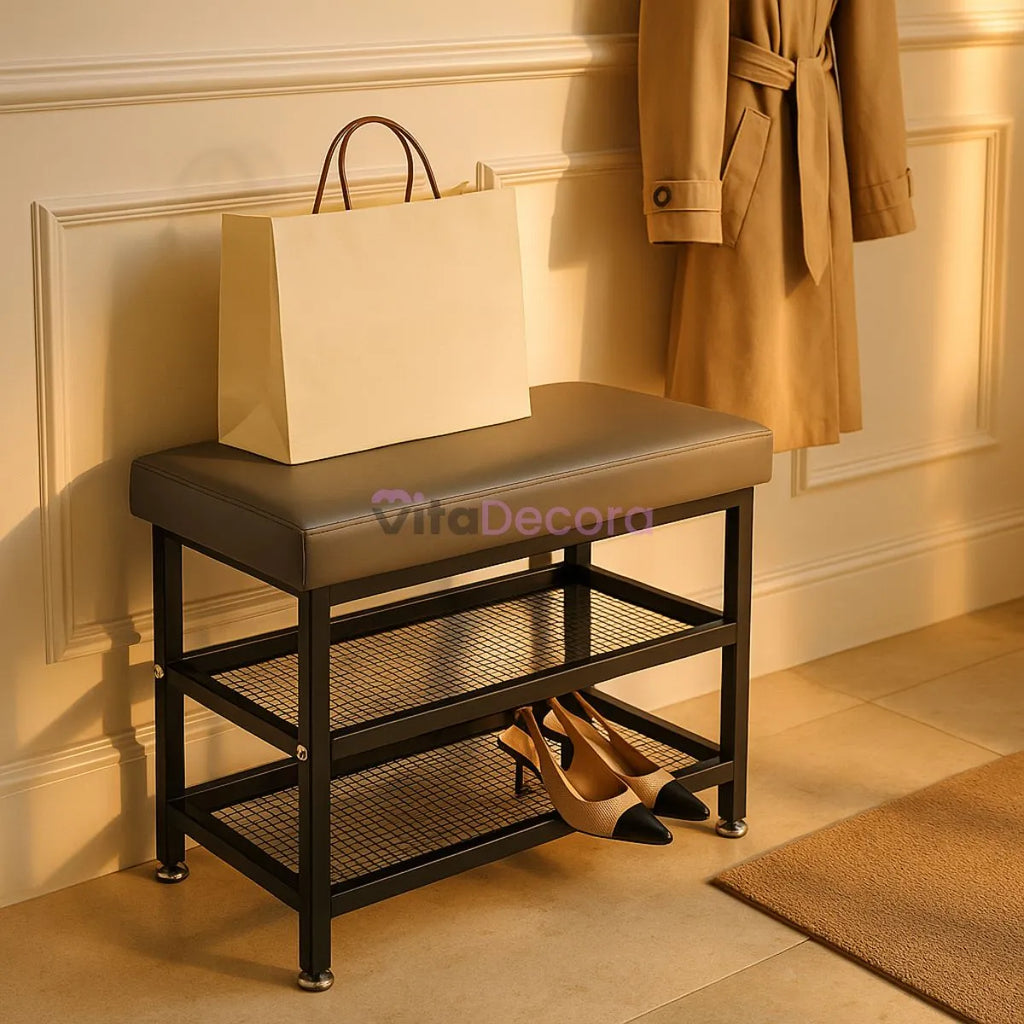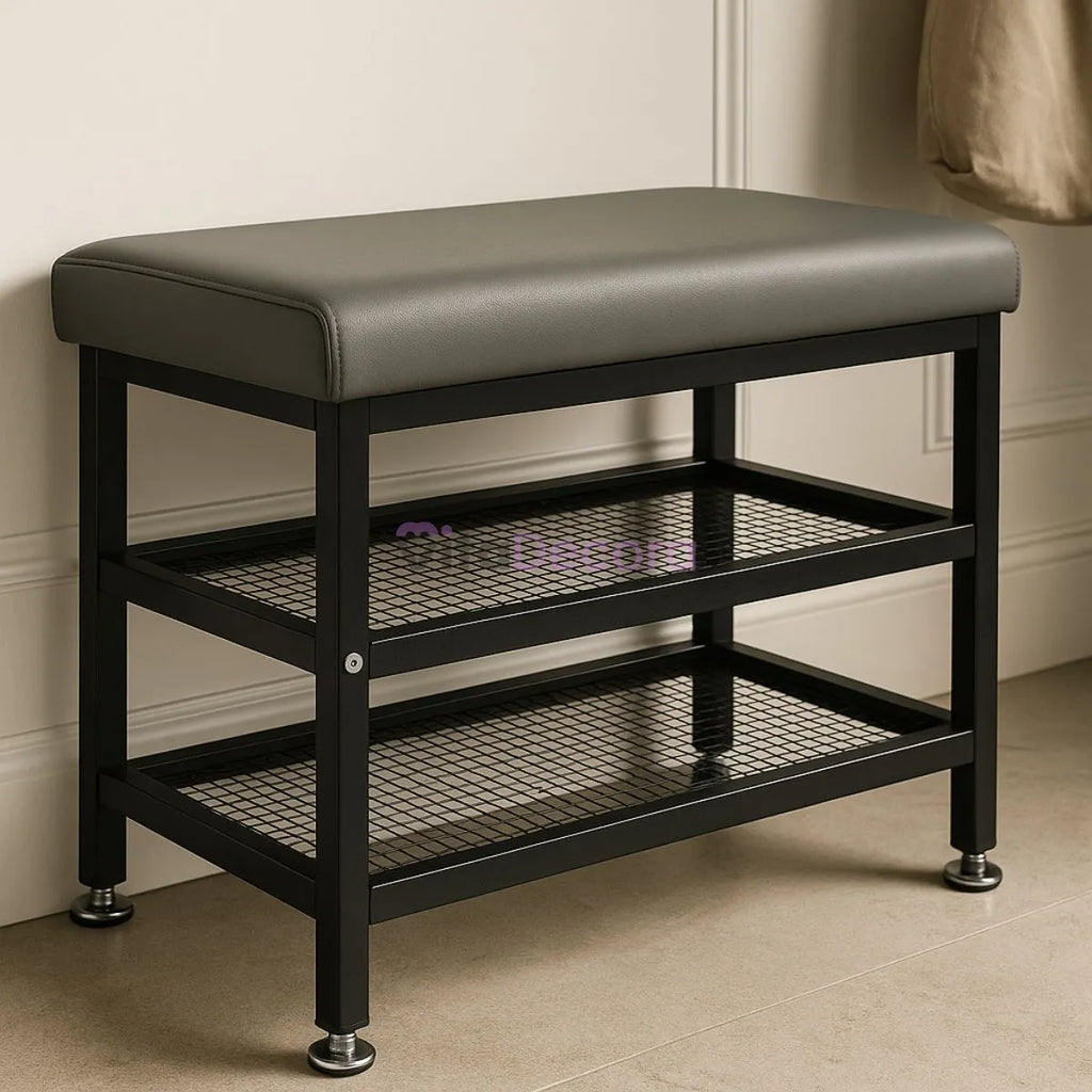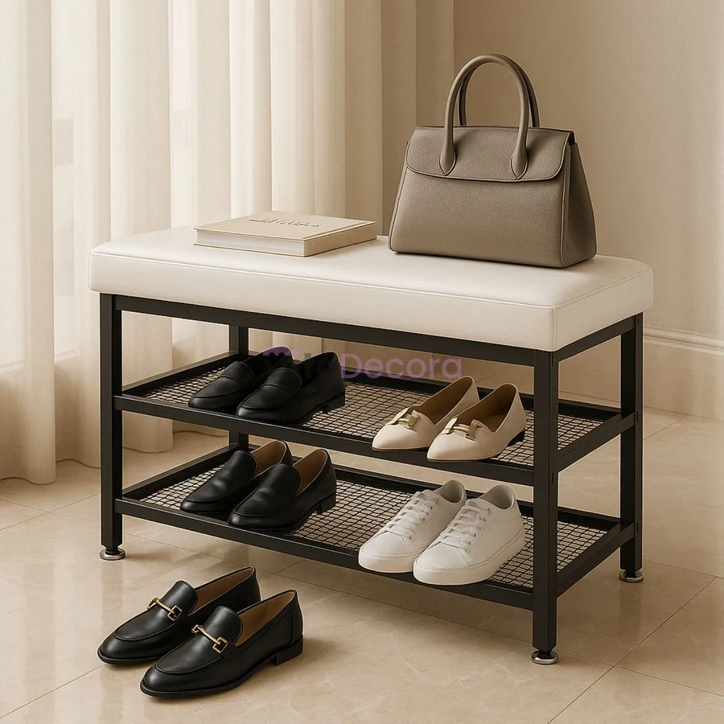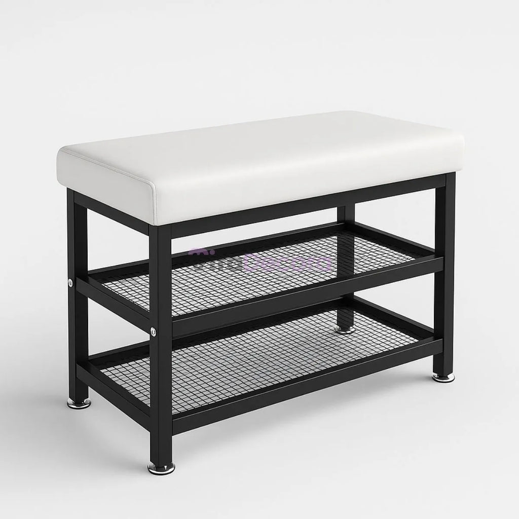 Assento acolchoado premium para trocar sapatos com conforto + 2 andares ventilados que mantêm até 6 pares organizados e livres de fungos.